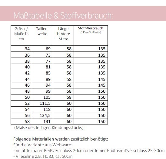 Details zum Schnittmuster: Das Papier-Schnittmuster enthält eine farbig gedruckte DIN A4-Broschüre mit Schritt-für-Schritt-Fotoanleitung, Angaben zum Stoffverbrauch & Nähhinweisen sowie alle Schnittmuster für die Größen 34 - 58 auf einem farbigen DIN A0-Bogen.