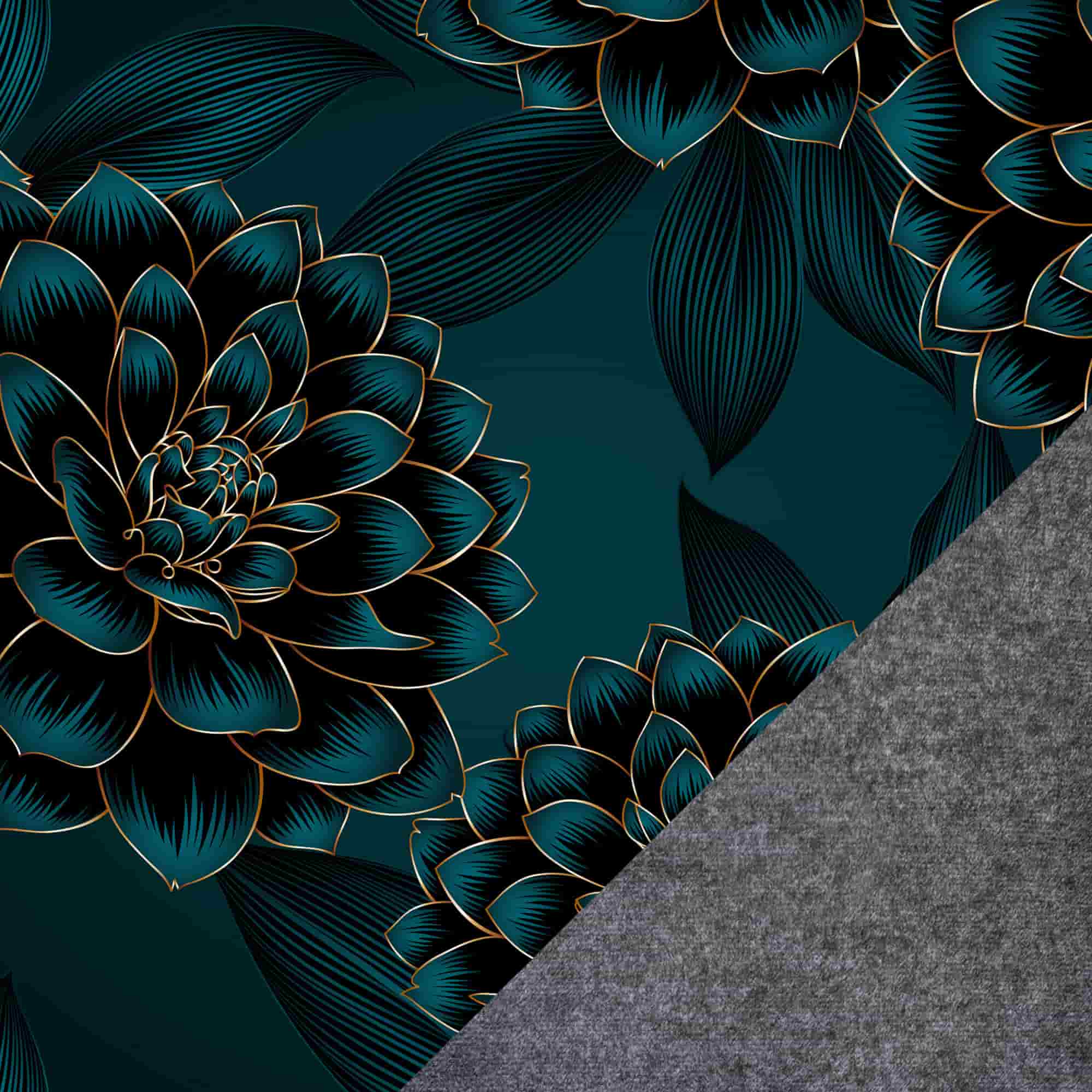 Trendige florale Designs auf Alpenfleece Isla. Auch im Winter wollen wir auf Blumen nicht verzichten – daher haben wir zwei brilliante Digitaldrucke auf kuscheligen Alpenfleece im Shop aufgenommen. Grafisch, verspielt in gedeckter kalter und warmer Farbe. Hier haben wir opulente große Blüten in Grün-Petrol mit Konturen in Goldoptik. Isa wärmt mit einer kuscheligen, graumelierten Fleeceabseite.