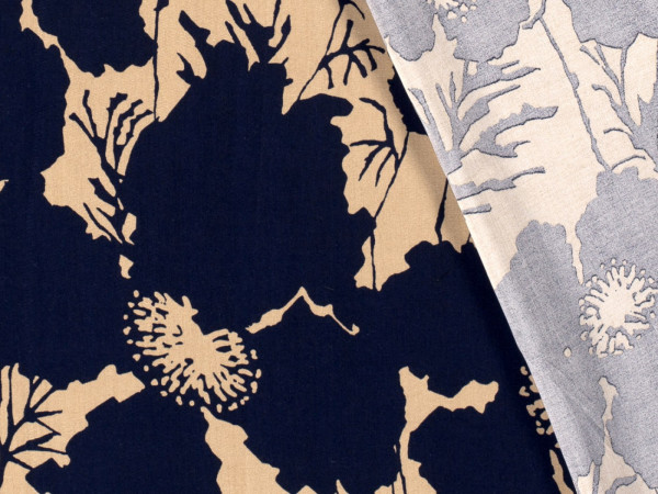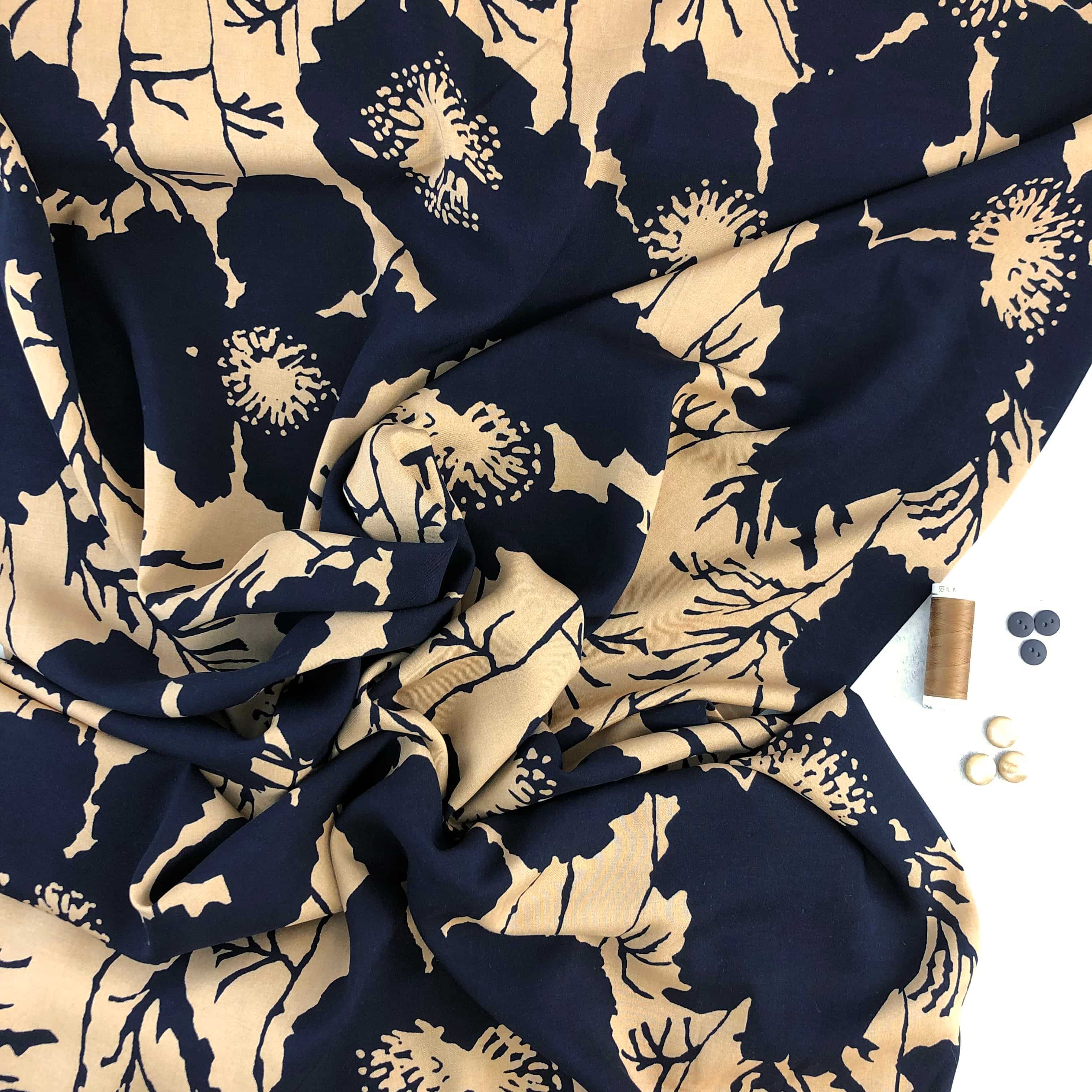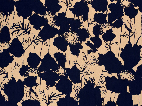 Schöne Bamboo Popeline mit Blumendruck - marine auf camel - ein Stoff, mit dem Du nicht übersehen wirst! Ideal für ausdrucksstarke Blusen und Kleider. Die bedruckte Popeline ist etwas fester und hat einen ganz tollen, weichen Griff. Dabei ist sie aber wunderschön leicht fallend und fließend. Das schöne, griffige Material ist ideal für Kleider, leichte Hosen aber auch für Blusen oder Blusenshirts.