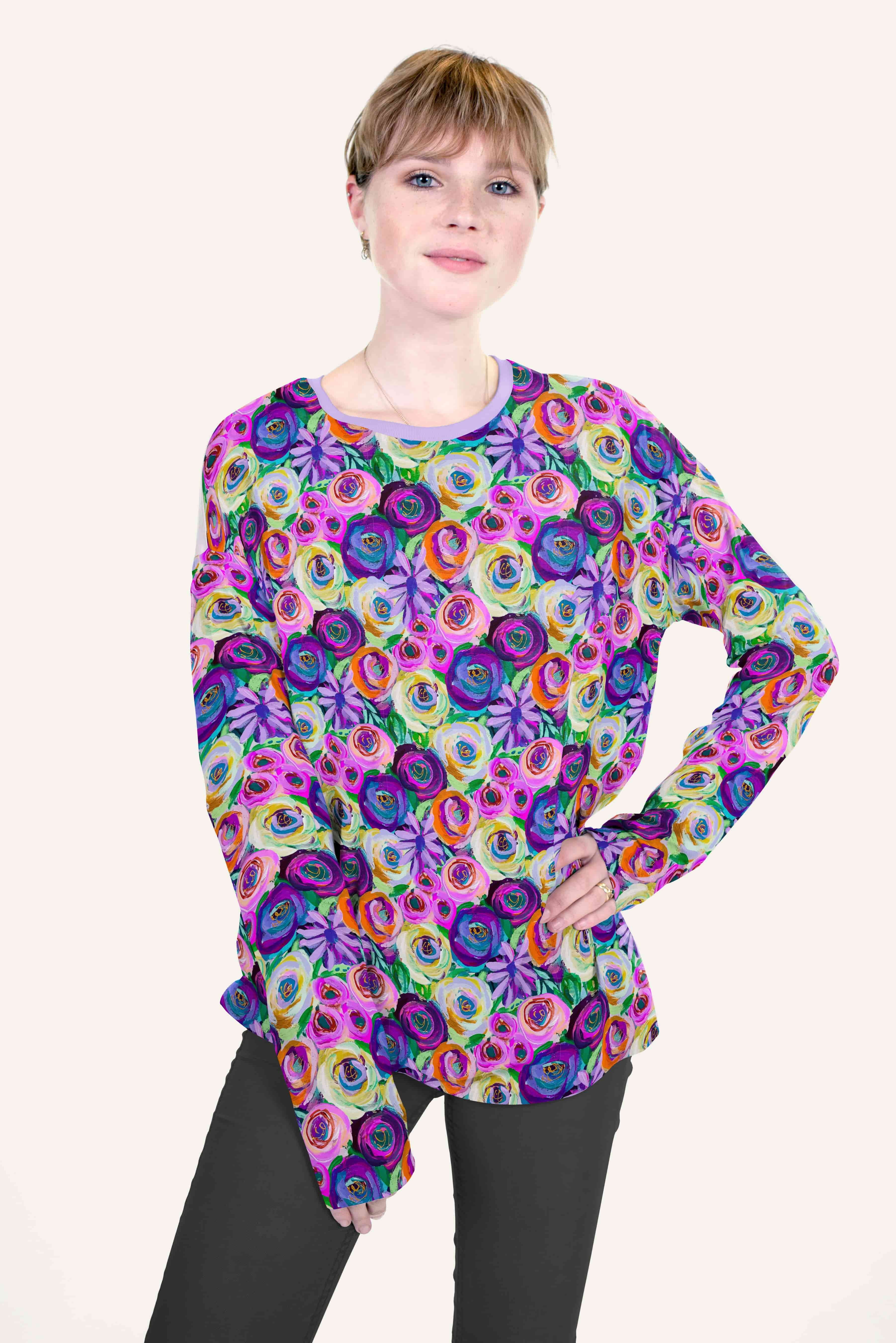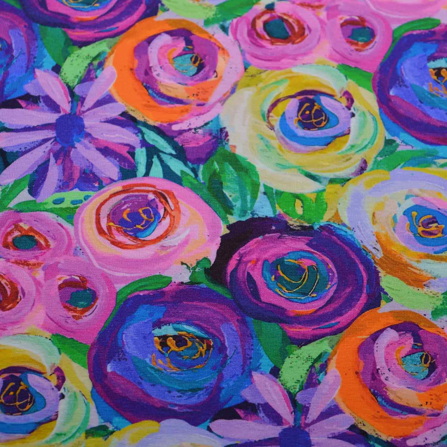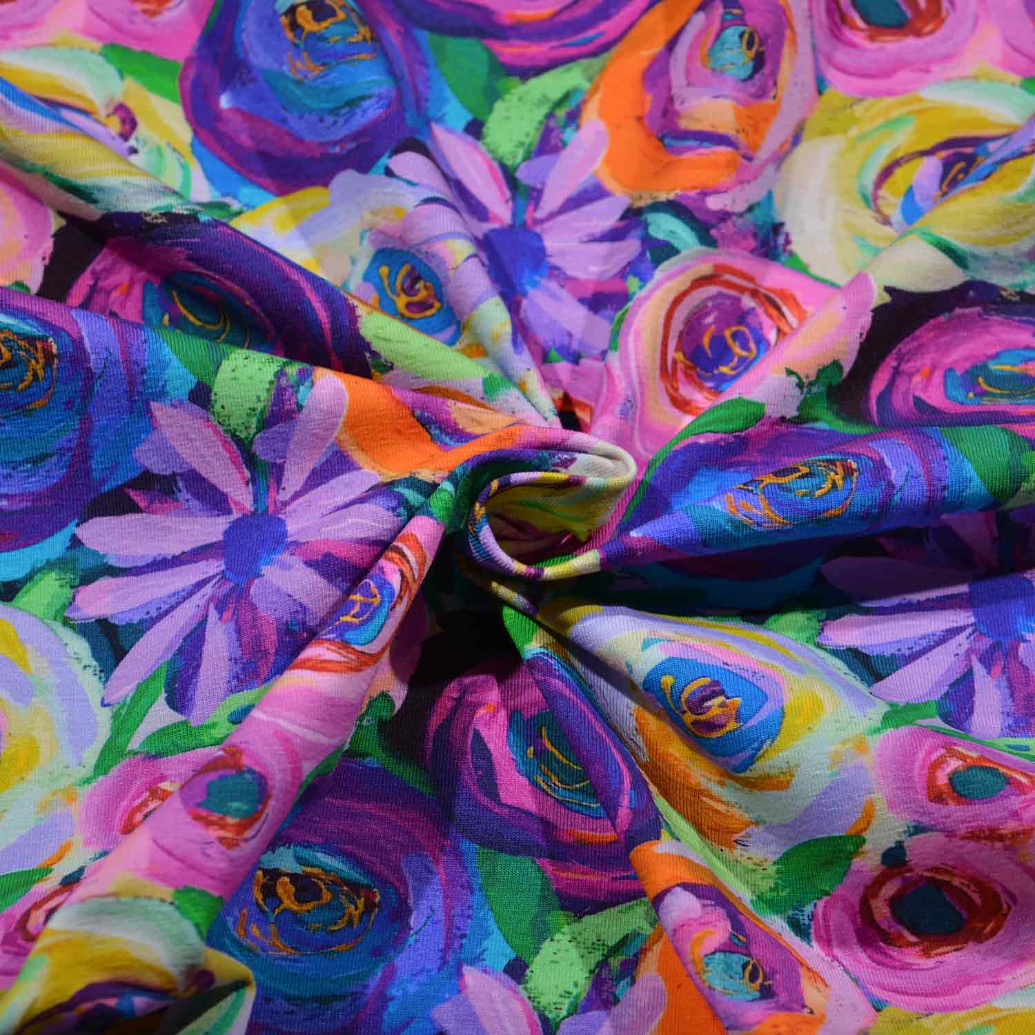 Verwende eine Jersey-Nadel und einen elastischen Stich oder deine Overlockmaschine, um den Stoff optimal zu verarbeiten. Achte beim Zuschnitt auf die Platzierung der Blumen – so entstehen harmonisch wirkende Schnittteile mit künstlerischem Flair.