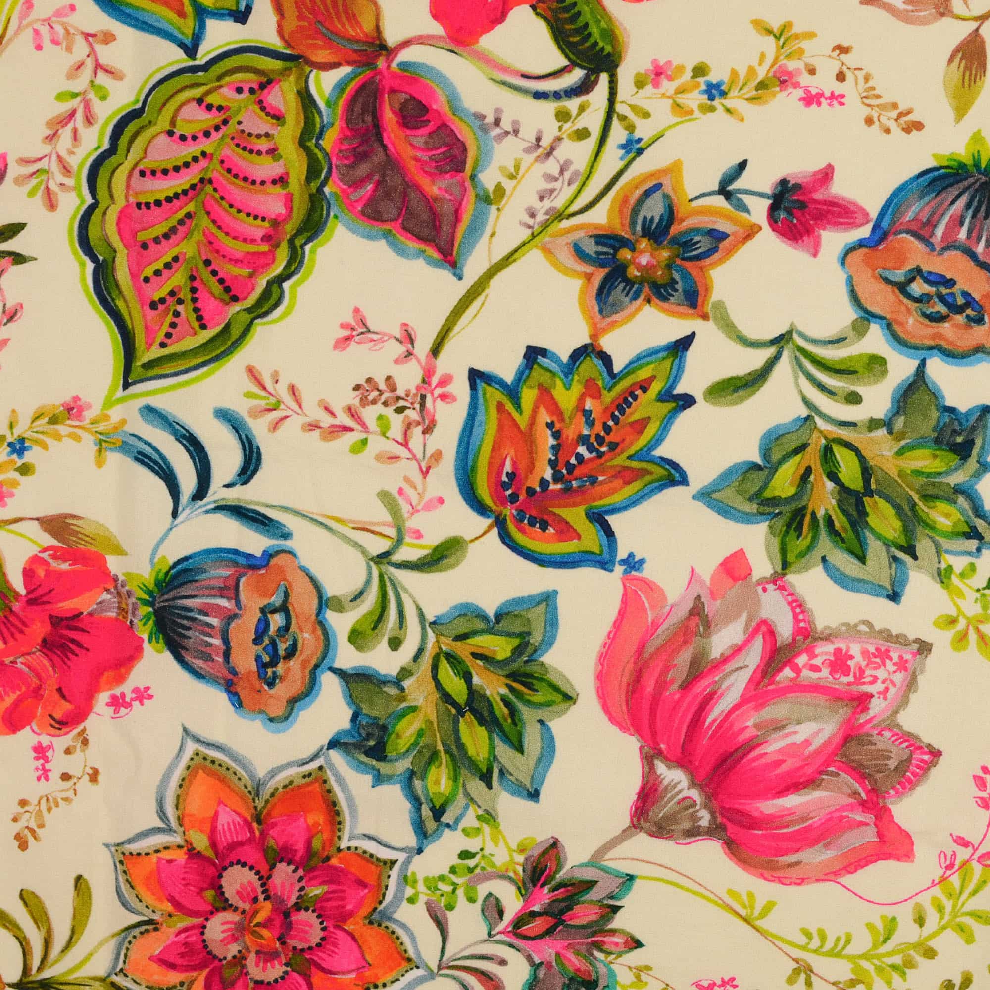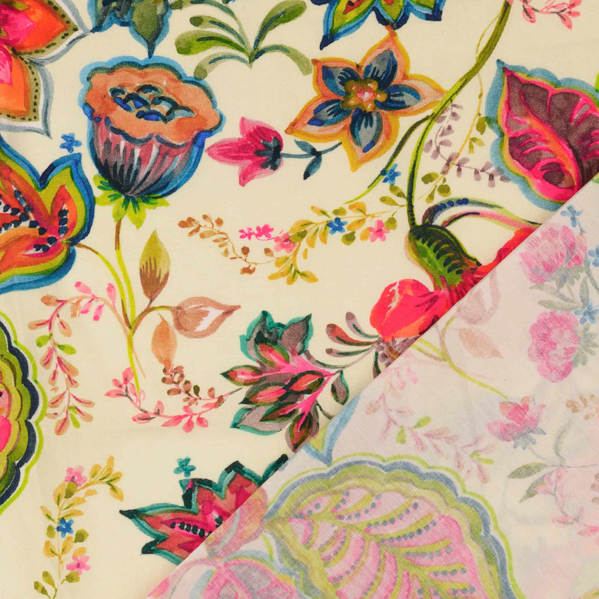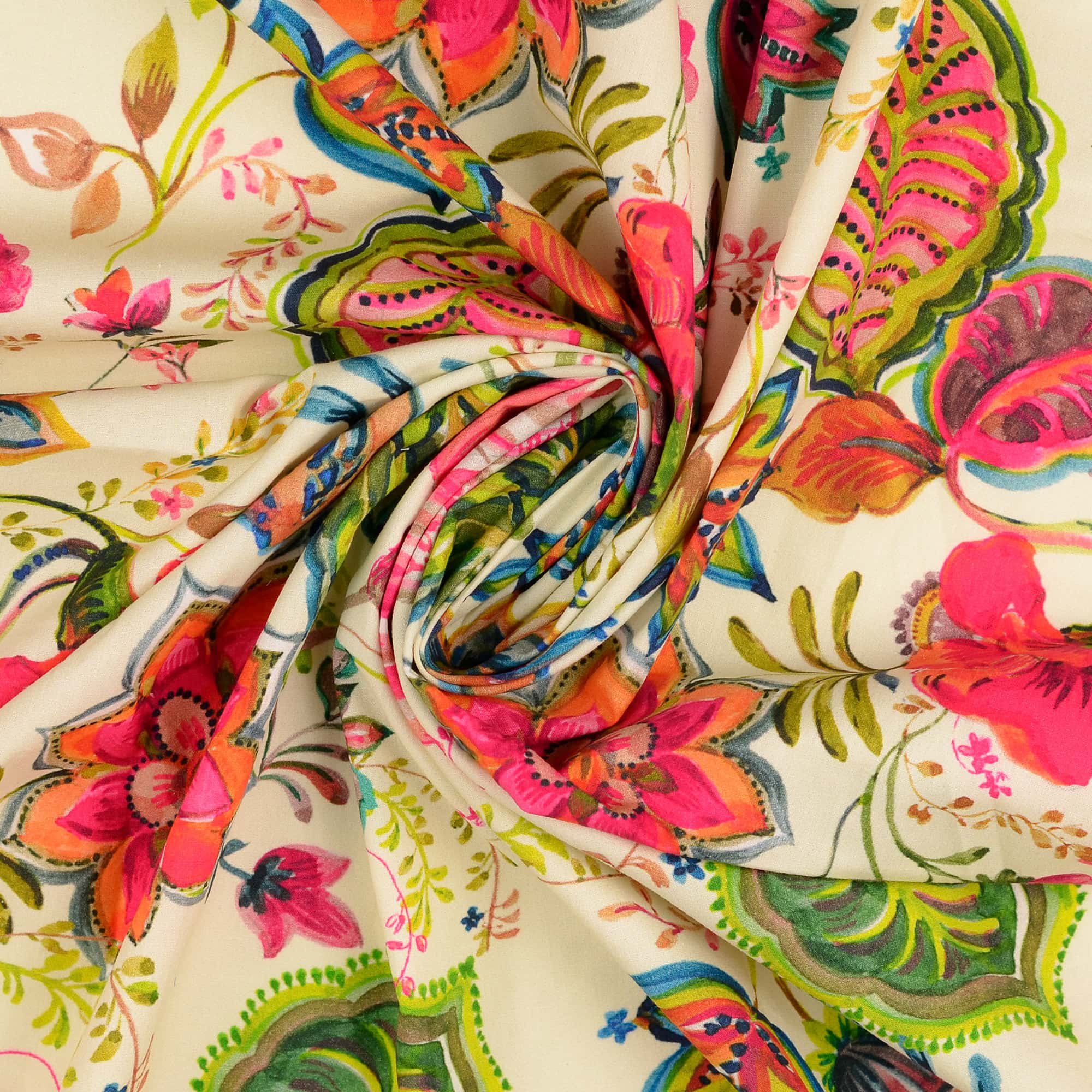 mit der für Popeline charakteristischen feinen Struktur. Mit diesem hochwertige Baumwollstoff (Popeline) kannst du dir luftige Sommerkleidung wie Blusen, Tuniken, Kleider oder Shirts und Shorts nähen. Sie hat einen schönen weichen Fall und einen Blumendruck in kräftigen Farben.