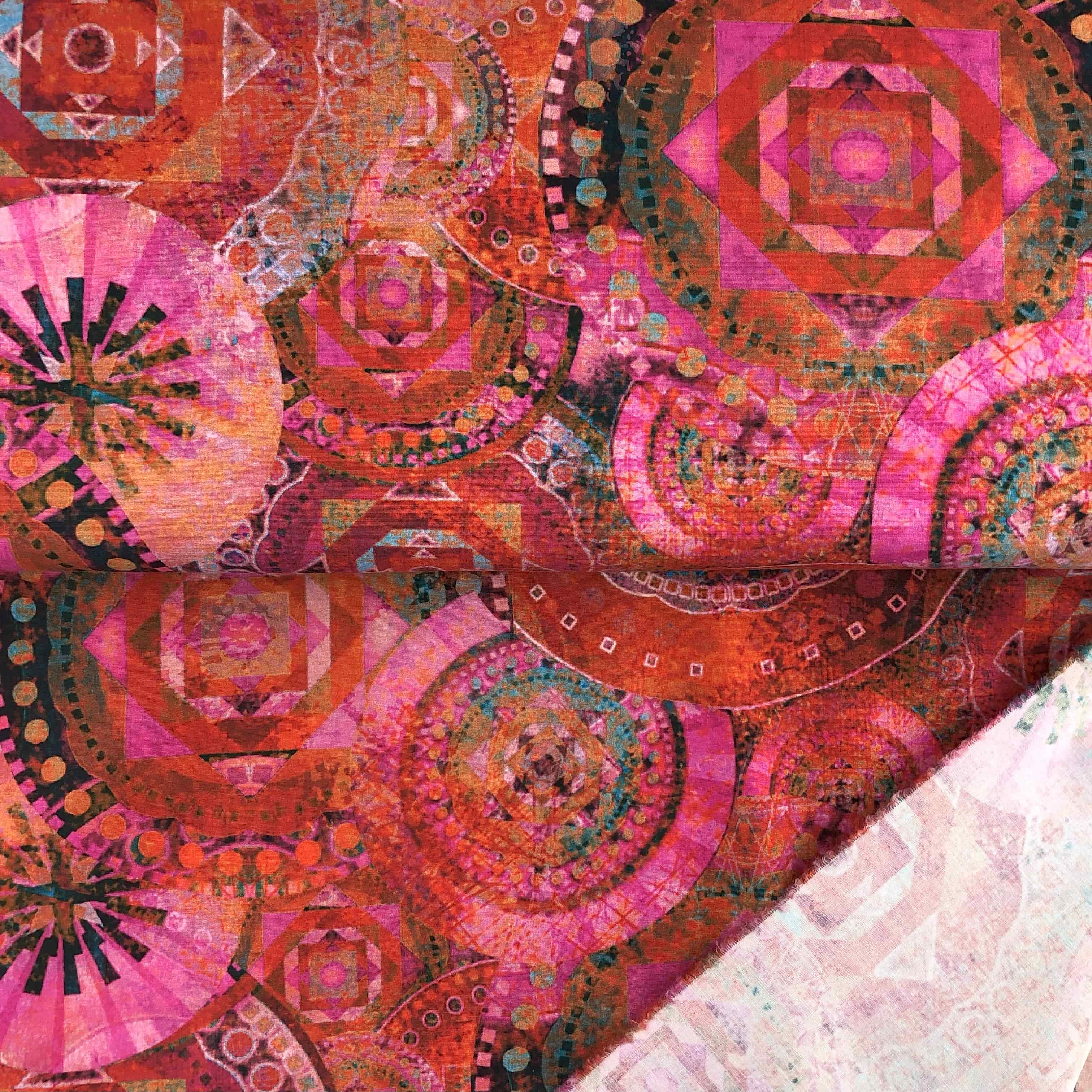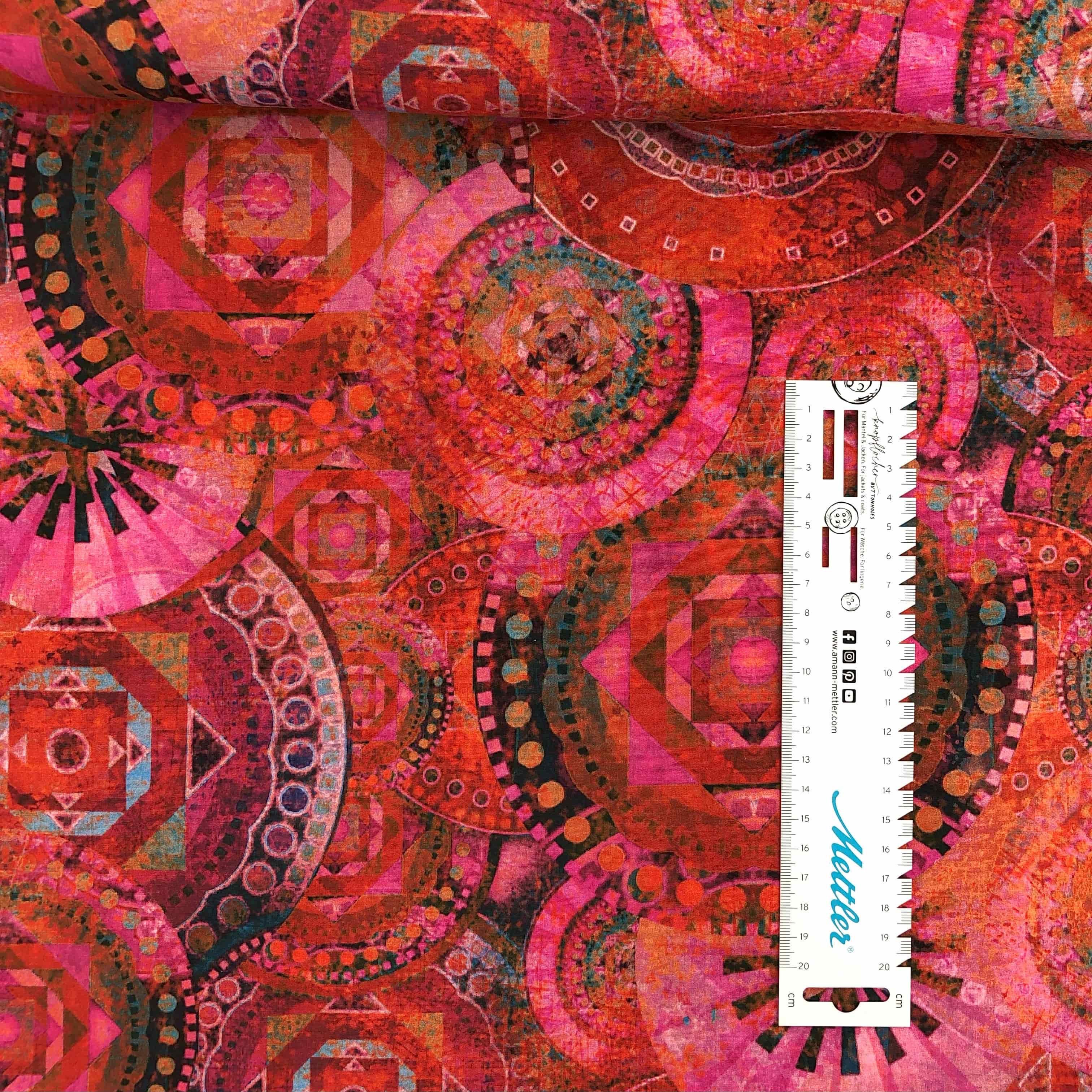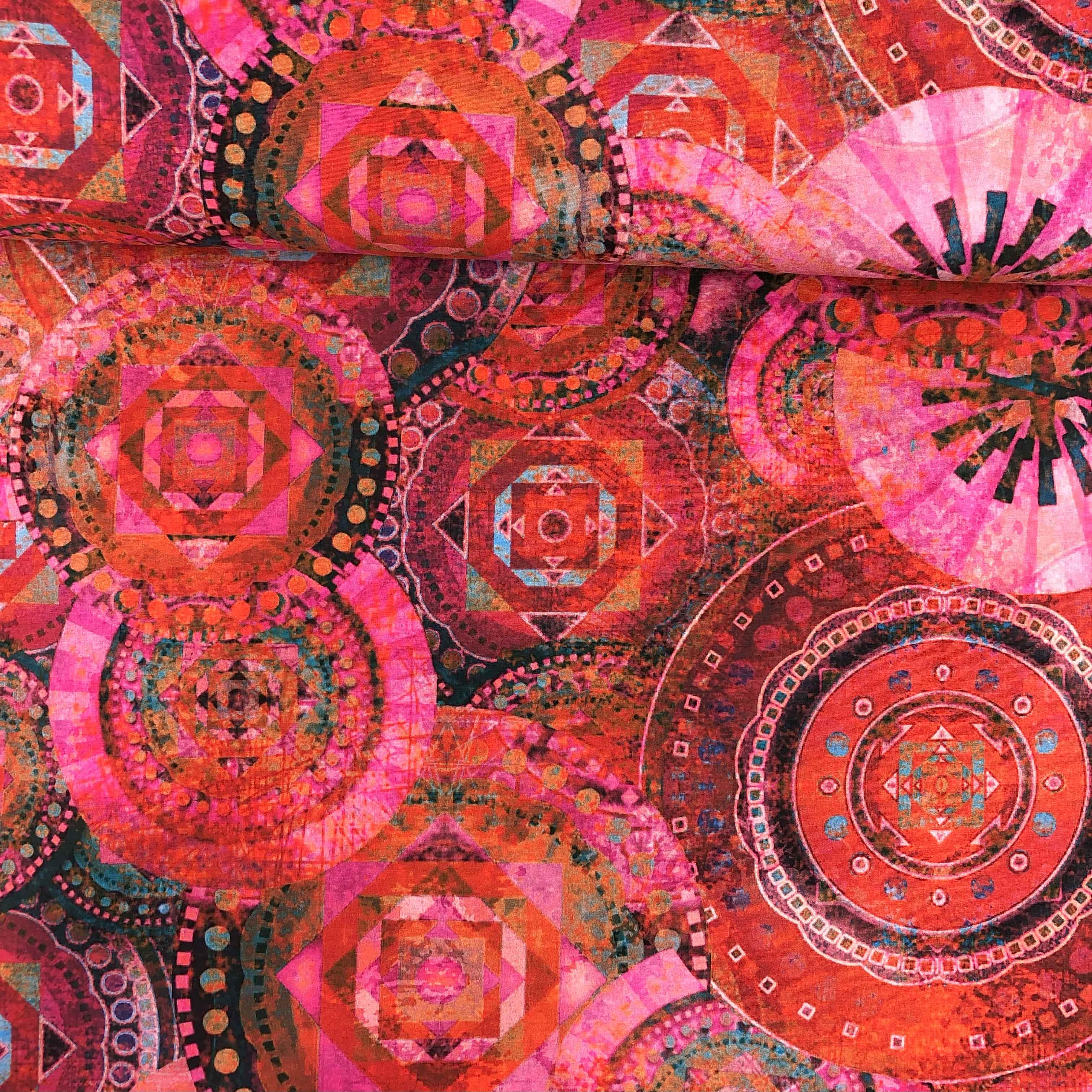 Überall, wo man hinschaut, sind auf dem Baumwollstretch wunderschöne Mandalas zu sehen. Viele rot-pink-bunte Mandalas reihen sich neben- und übereinander auf dem wunderschönen Stretch-Popeline. Dieser leicht elastische Stoff ist ideal für Sommerhosen, Blusen, Röcke, Kleider und Tuniken.
