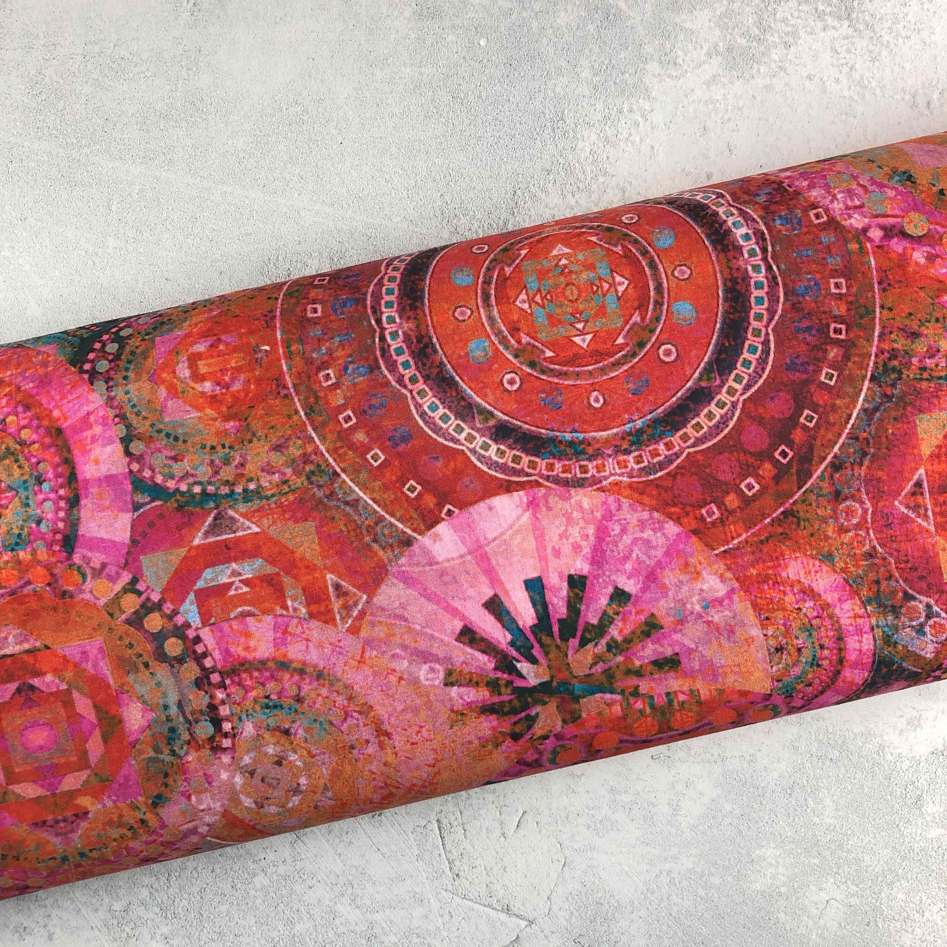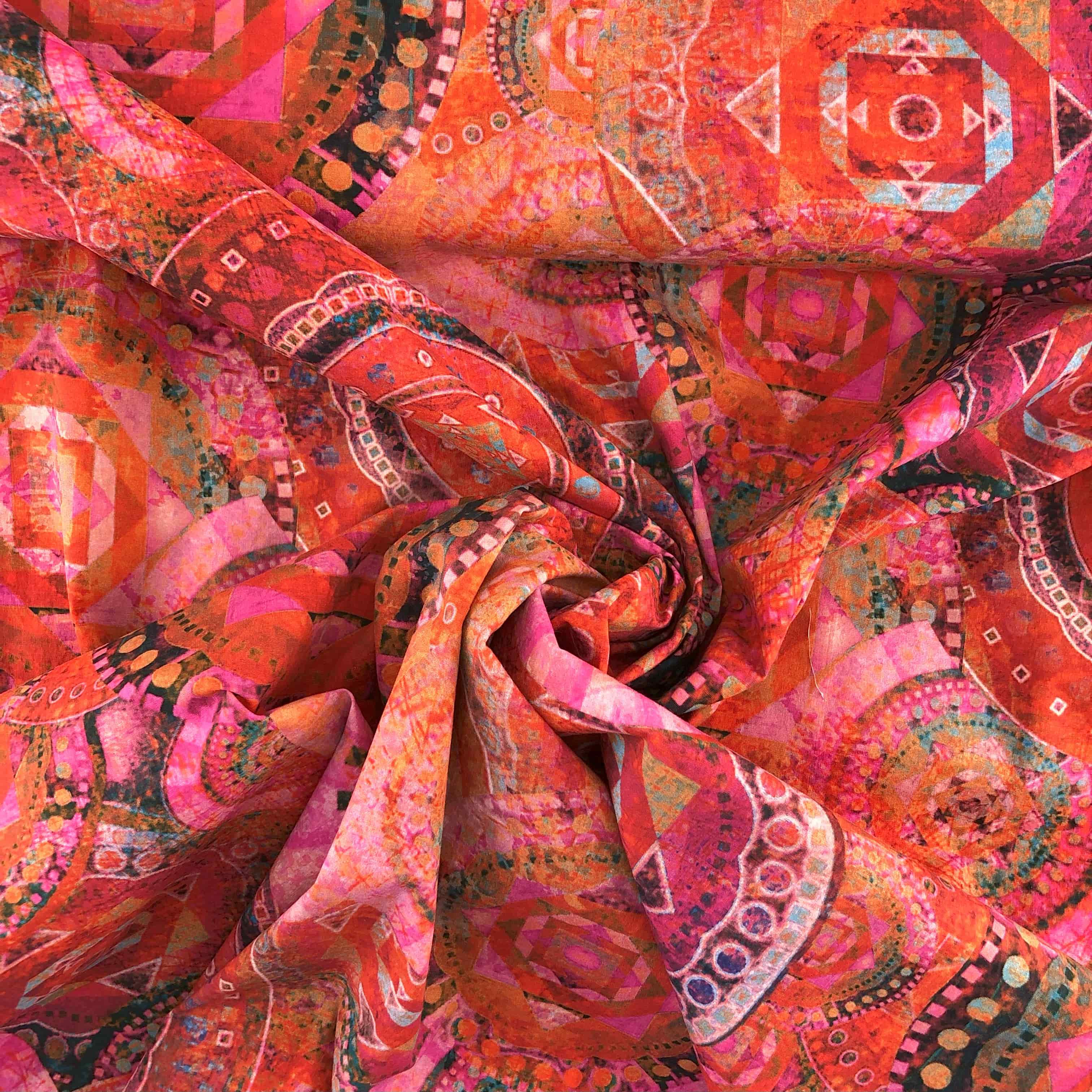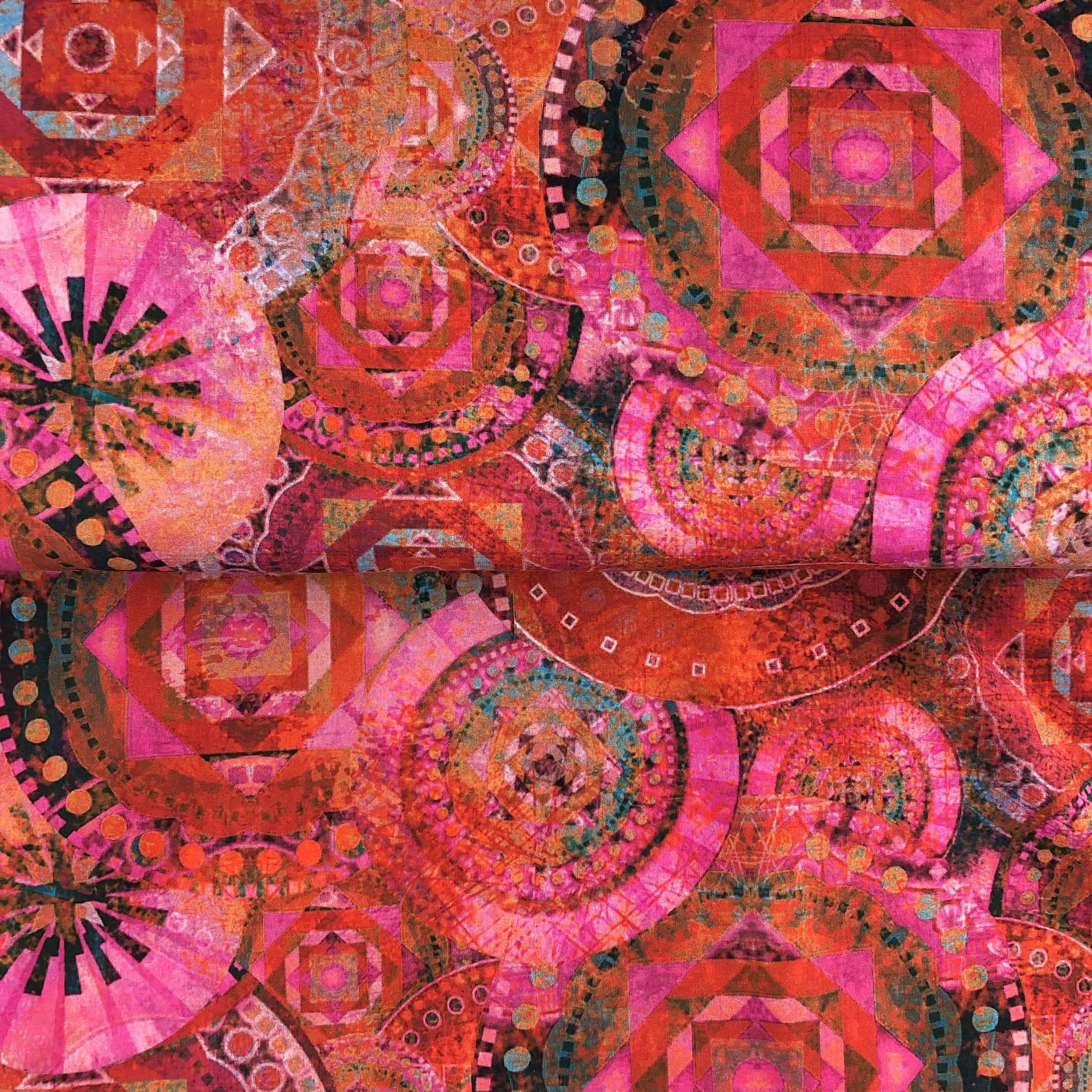 Überall, wo man hinschaut, sind auf dem Baumwollstretch wunderschöne Mandalas zu sehen. Viele rot-pink-bunte Mandalas reihen sich neben- und übereinander auf dem wunderschönen Stretch-Popeline. Dieser leicht elastische Stoff ist ideal für Sommerhosen, Blusen, Röcke, Kleider und Tuniken.