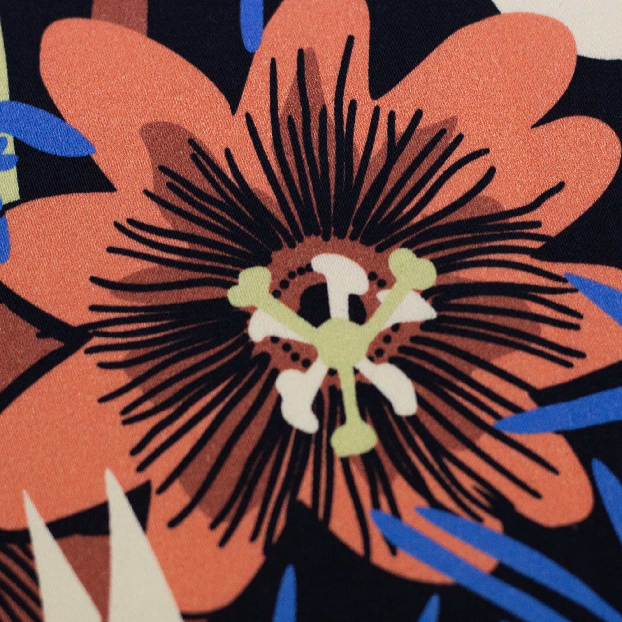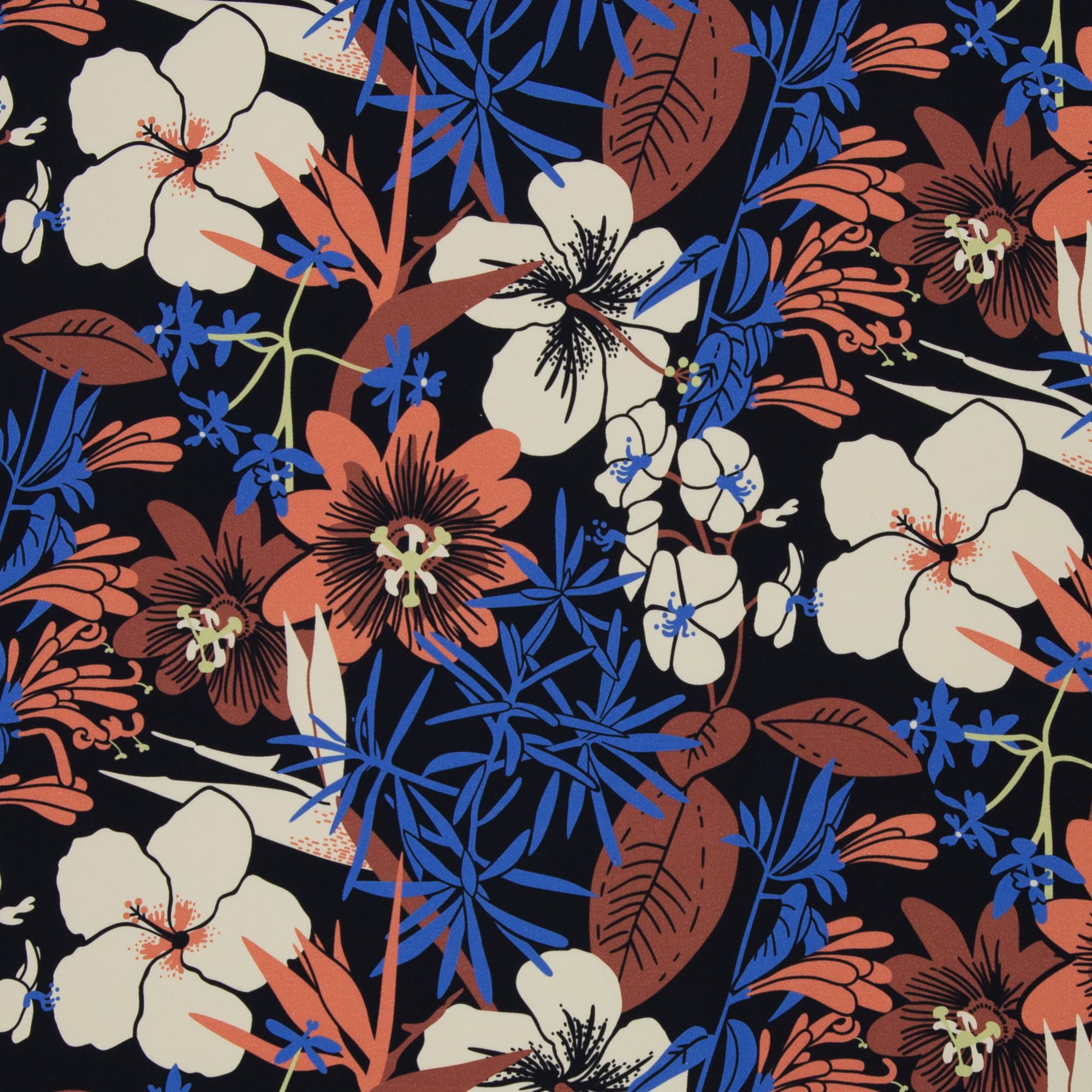 Dieser Baumwoll-Stretch-Satin blüht von allen Seiten. Viele bunte Blumen auf schwarz-blauem Grund zieren diesen wunderschönen Stretch-Satin. Der leicht elastische Stoff stammt aus der Kollektion Bloom by Käselotti. Ideal für Blusen, Hosen, Röcke, Kleider und coole Jacken!