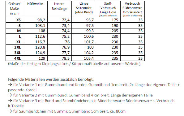 Das Fußbündchen wird je nach Belieben mit breitem Gummiband, Bündchenware oder einfach gesäumt genäht. Die Jogginghose kann mit oder ohne Taschen gestaltet sowie für den Sport auch gekürzt und als Shorts getragen werden.