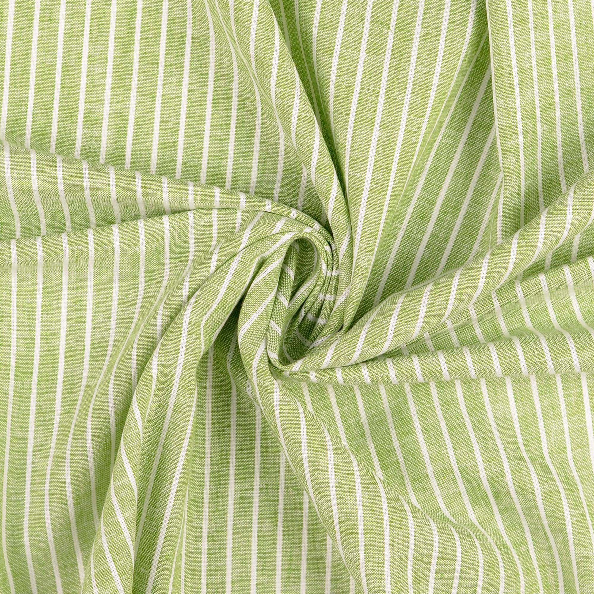 Das feine Streifenmuster in Weiß/Schilf verleiht dem Stoff eine besondere Raffinesse und macht ihn perfekt für moderne und zeitlose Designs. Mit einem Gewicht von 160 g/m² ist er ideal für sommerliche Kleidung, zarte Kinderprodukte und elegante Heimtextilien. Da er etwas durchscheinend sein kann, eignet sich ein Futterstoff oder ein Unterkleid für blickdichte Designs.