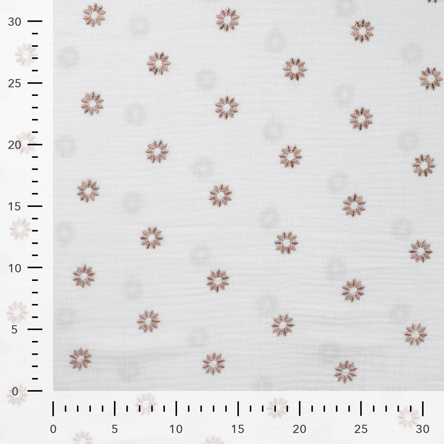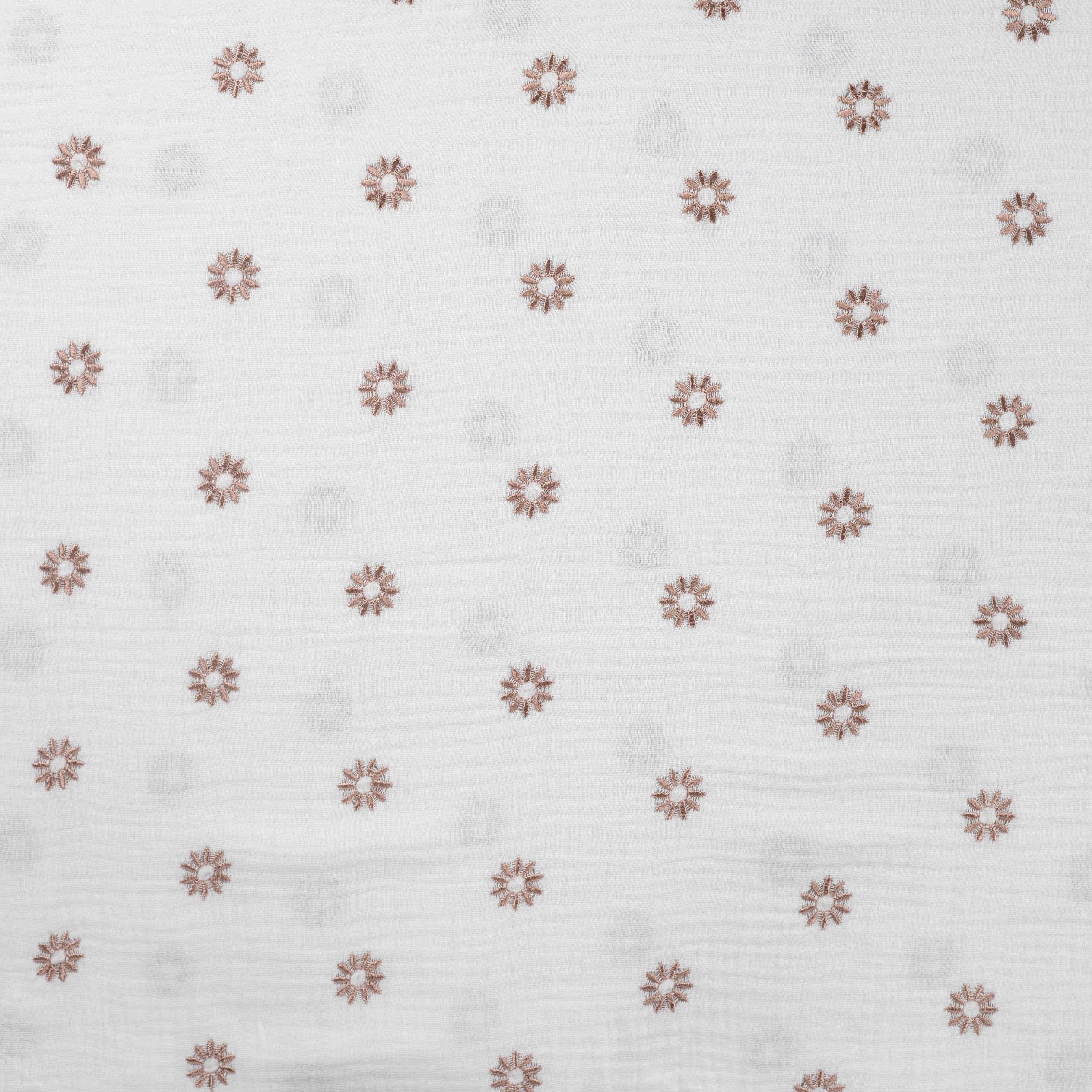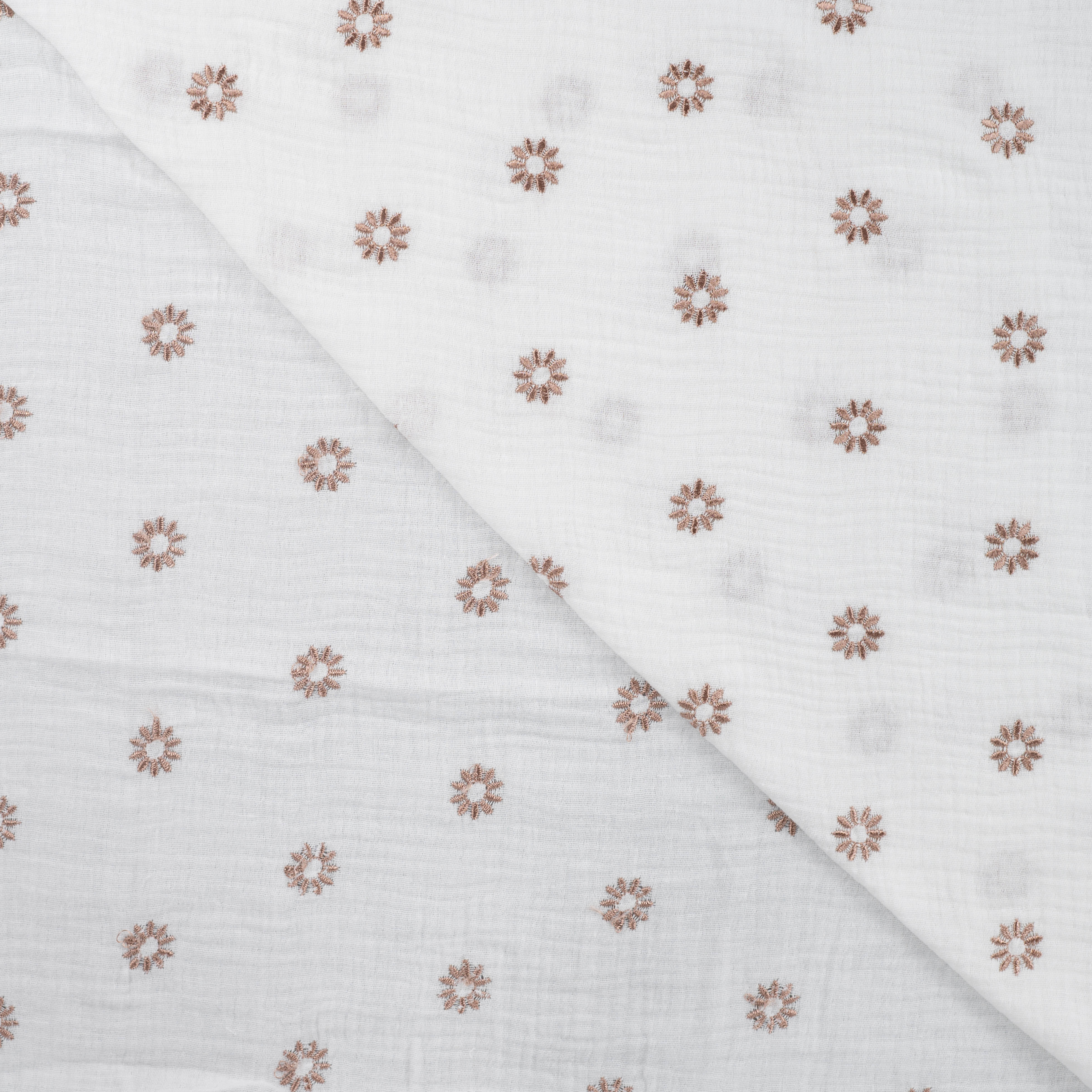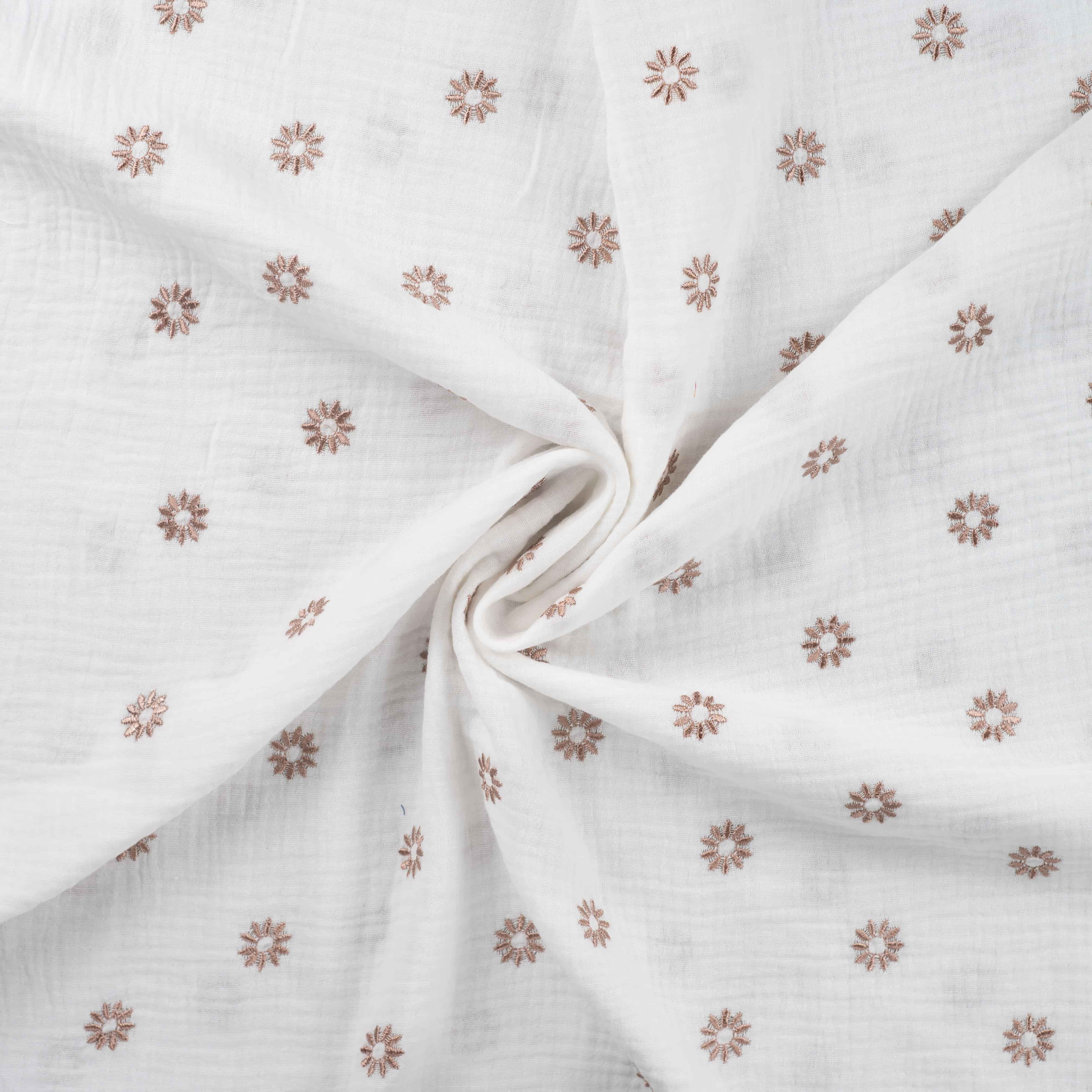 Dieser hochwertige Musselin in der eleganten Farbe Ecru bezaubert mit seiner Sonnenblumen-Stickerei in warmem Bronze. Mit einem Flächengewicht von 130 g/m² ist er wunderbar leicht und weich, perfekt für stilvolle und luftige Kreationen.