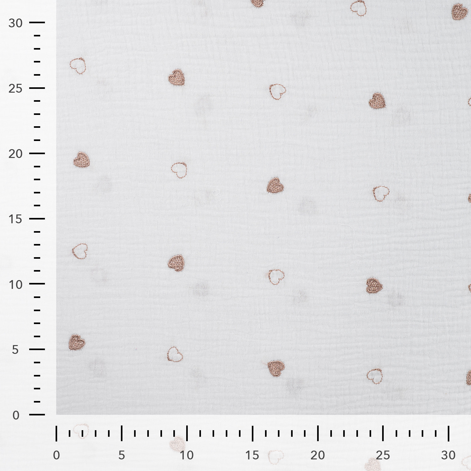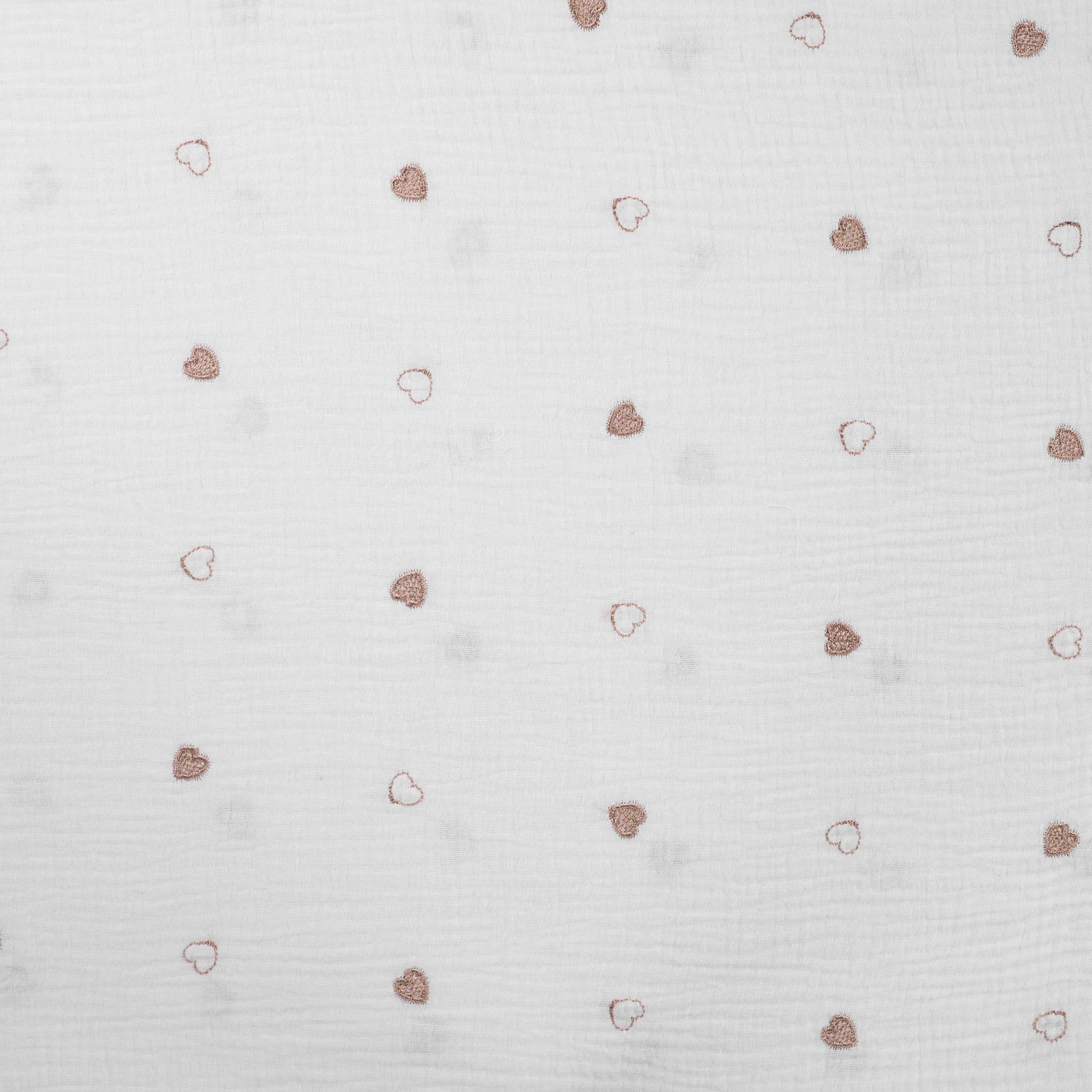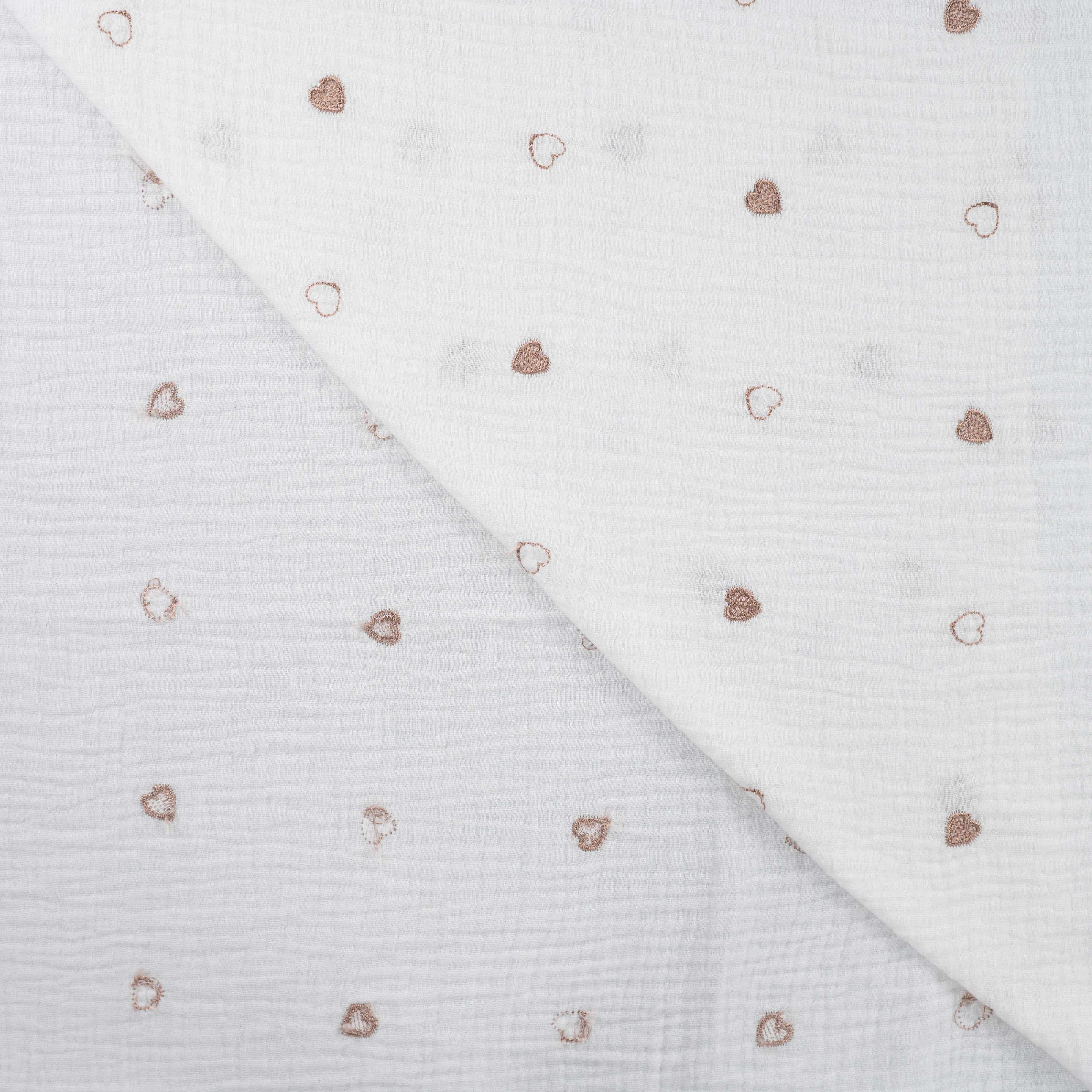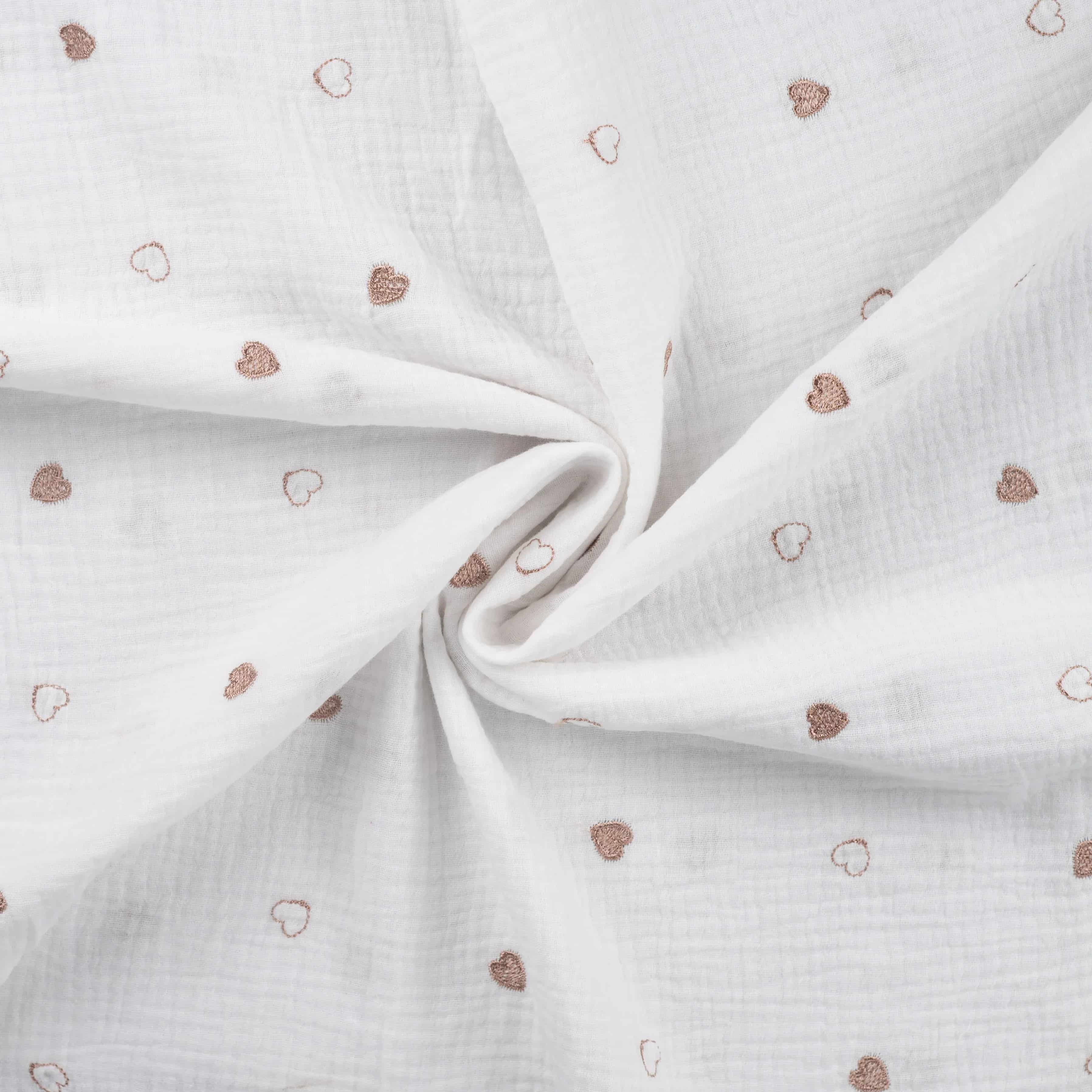 Dieser hochwertige Musselin in der eleganten Farbe Ecru bezaubert mit seiner liebevollen Herzchen-Stickerei in warmem Bronze. Mit einem Flächengewicht von 130 g/m² ist er wunderbar leicht und weich, perfekt für stilvolle und luftige Kreationen.