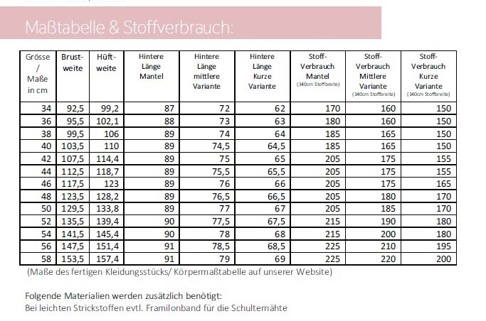 Details zum Schnittmuster: Das Papier-Schnittmuster enthält eine farbig gedruckte DIN A4-Broschüre mit Schritt-für-Schritt-Fotoanleitung, Angaben zum Stoffverbrauch & Nähhinweisen sowie alle Schnittmuster für die Größen 34 - 58 auf einem farbigen DIN A0-Bogen.