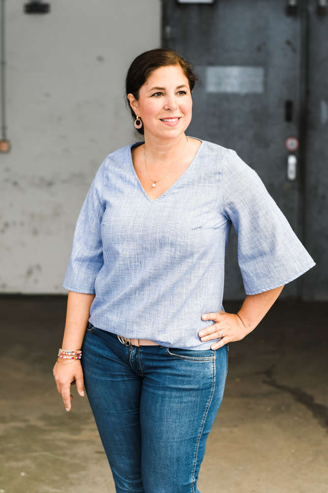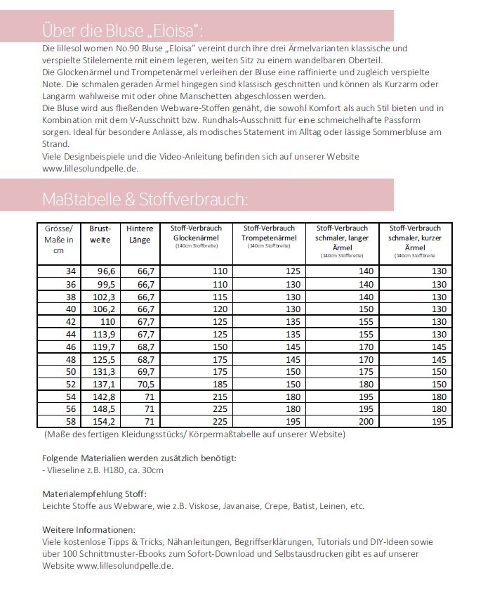 ein vielseitiges Schnittmuster, das klassische und verspielte Elemente auf harmonische Weise vereint. Mit drei verschiedenen Ärmelvarianten bietet die Bluse eine Fülle an Styling-Möglichkeiten. Die Glockenärmel und Trompetenärmel verleihen dem Oberteil eine raffinierte und verspielte Note, während die schmalen geraden Ärmel eine zeitlose Eleganz ausstrahlen und je nach Wunsch als Kurzarm oder Langarm mit oder ohne Manschetten genäht werden können.