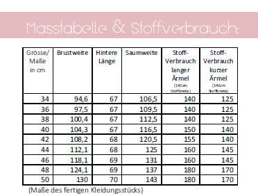 Details zum Schnittmuster: Das Papier-Schnittmuster enthält eine farbig gedruckte DIN A4-Broschüre mit Schritt-für-Schritt-Fotoanleitung, Angaben zum Stoffverbrauch & Nähhinweisen sowie alle Schnittmuster für die Größen 34 - 50 auf einem farbigen DIN A0-Bogen.