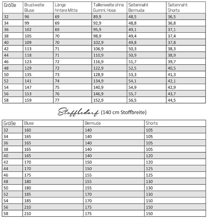 Details zum Schnittmuster: Dieses Set enthält alle Schnittmusterteile in den Größen 32-58 in Farbe auf einem DIN A0 Bogen und eine ausführlich bebilderte Nähanleitung als DIN A4 Broschüre. Stoffempfehlung: Webware, Sommerstoffe wie z. B. Viskose, leichter Frottee, Musselin oder Leinenstoff