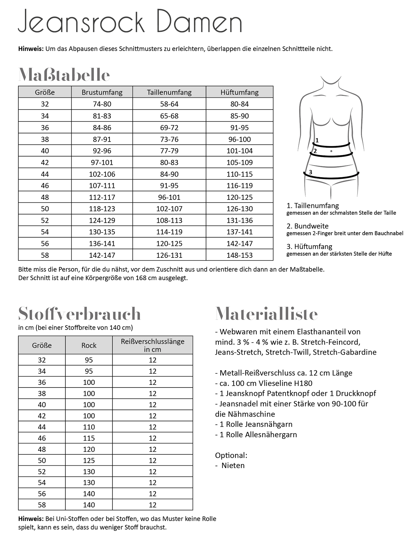 Der Jeansrock ist ein zeitloser Klassiker, der aus der Mode nicht wegzudenken ist. Kombiniere ihn im Sommer mit einem luftigen Top, Shirt, Blusenshirt und Sandalen oder im Winter mit einem dicken Pulli, Strumpfhosen und Boots - Du bist immer gut angezogen. Für den Jeansrock eignen sich Stoffe mit geringem Elasthan-Anteil. Er wird mit Reißverschluss genäht und verfügt über die typische Five-Pocket-Ausstattung.