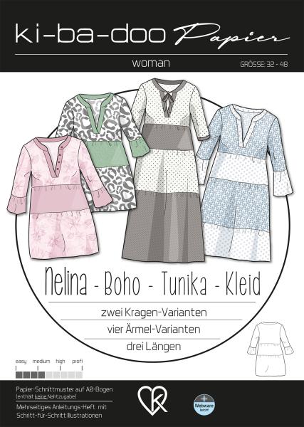 Mit dem Schnittmuster Nelina nähst Du Dir ein luftiges Kleid im Boho-Stil. Es ist weit schwingend im Rockbereich und locker sitzend im oberen Blusenbereich. Das Kleid verfügt über verschiedene Rocklängen und Ärmellängen. Der Kragen hat zwei Varianten: Stehkragen oder Schluppe. Der ist Ausschnitt ist leicht V-förmig angelegt.