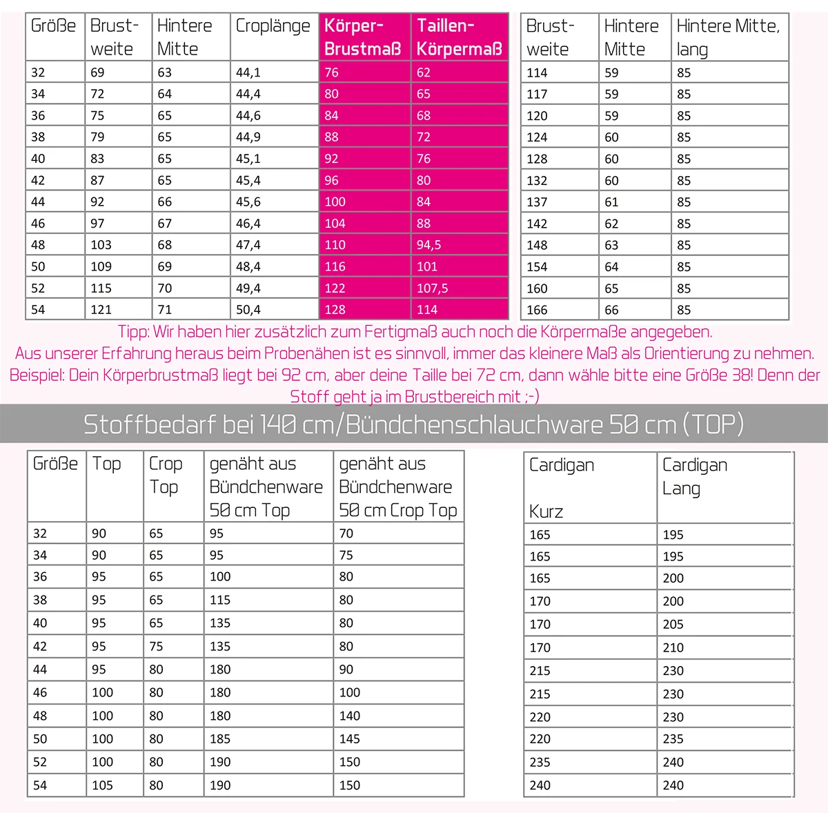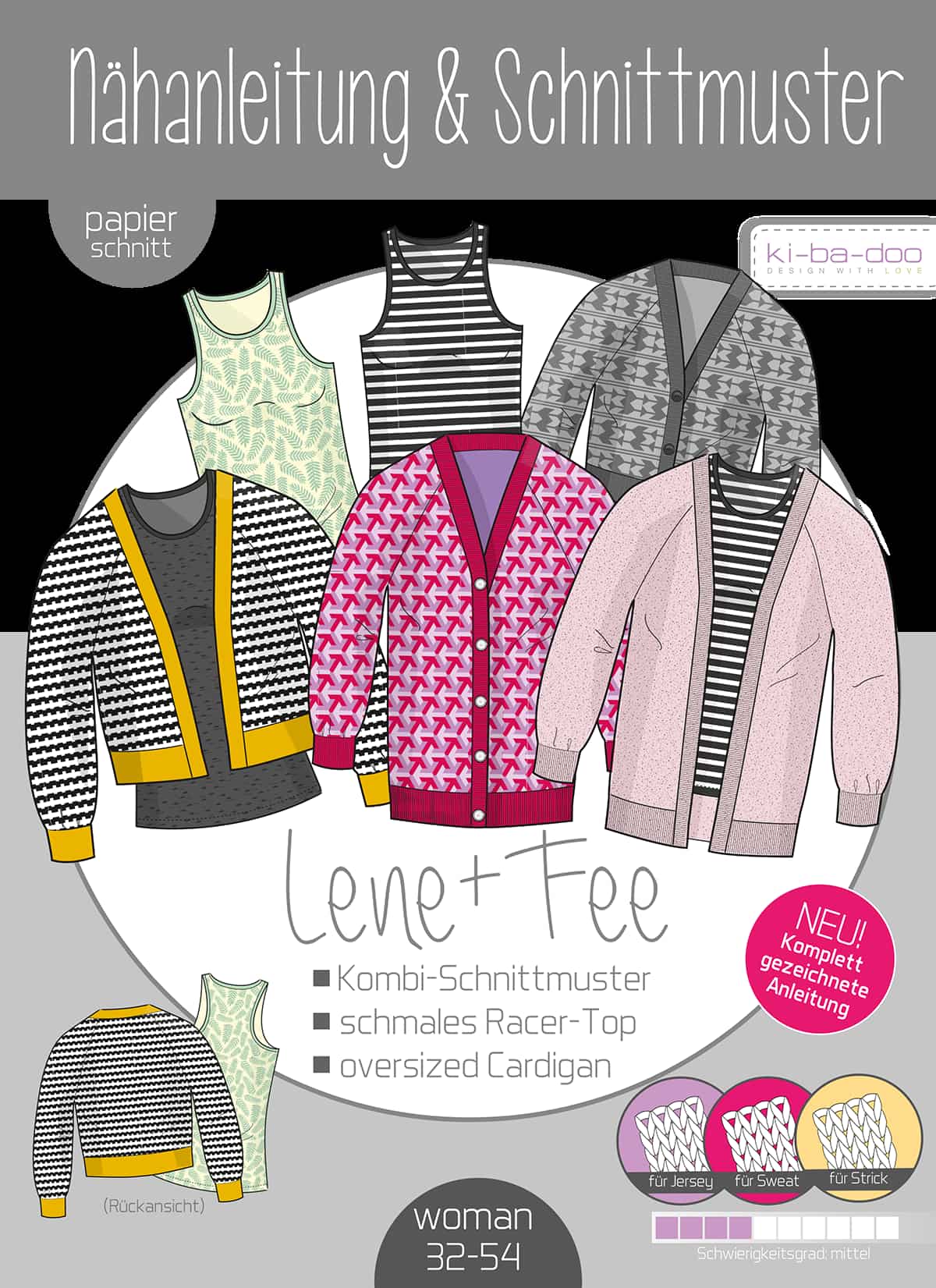 Details zum Schnittmuster: Das Schnittmuster beinhaltet die Größen 32-54. Dieses Set besteht aus einem DIN A0-Bogen in Farbe und einer ausführlichen bebilderten Nähanleitung als gedruckte DIN A4-Broschüre.
