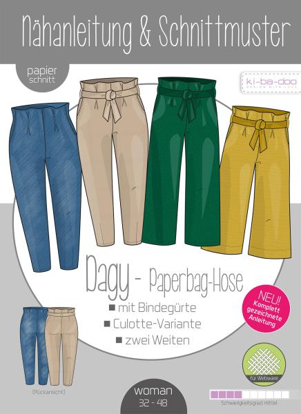Mit dem Schnittmuster Dagy nähst du dir eine Hose mit einem hohem Paperbag-Bund in einer angesagten Karottenform. Zusätzlich gibt es eine weite Beinvariante in zwei verschiedenen Längen: als weite lange Hose oder als Culotte. Geschlossen wird die Hose mit einem Reißverschluss. Zusätzliche optionale Gürtelschlaufen und das Bindeband runden den Look ab.