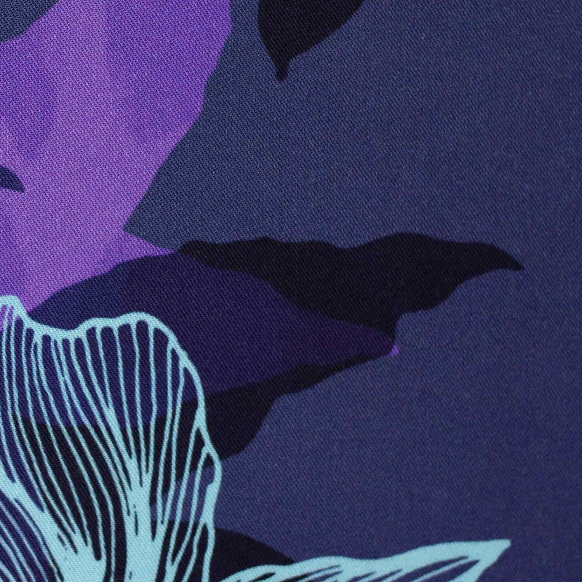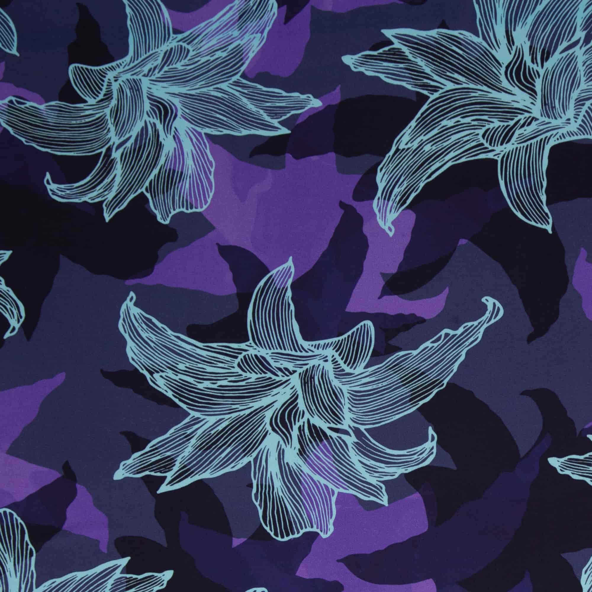 mit türkisen Blüten auf Blautönen. Diese Viskose hat einen griffige Qualität. Sie eignet sich besonders gut für Sommerkleider, Blusen und Röcke.
