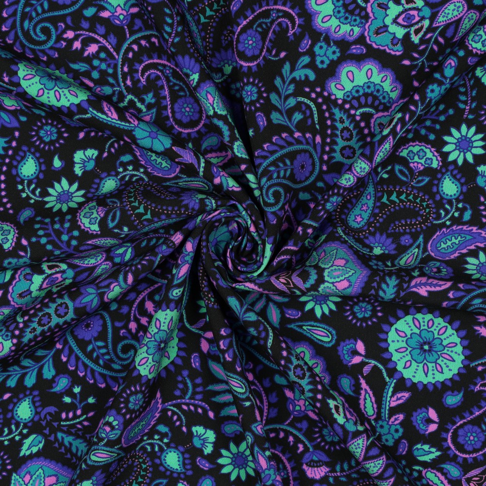 Tauche ein in die Welt der Nachhaltigkeit mit unserer Viskose aus Lenzing EcoVero, veredelt durch ein klassisches Paisley-Muster auf elegantem Schwarz. Dieser hochwertige Stoff verbindet Umweltbewusstsein mit Stil und Vielseitigkeit. Seine leichte, fließende Textur macht ihn ideal für elegante Blusen, schicke Kleider, Röcke, Tücher oder raffinierte Accessoires. Mit seiner nachhaltigen Herstellung und dem zeitlosen Design ist dieser Stoff perfekt für stilvolle Kreationen, die sowohl die Natur als auch deinen Kleiderschrank bereichern. Schaffe etwas Besonderes – für dich und die Umwelt!